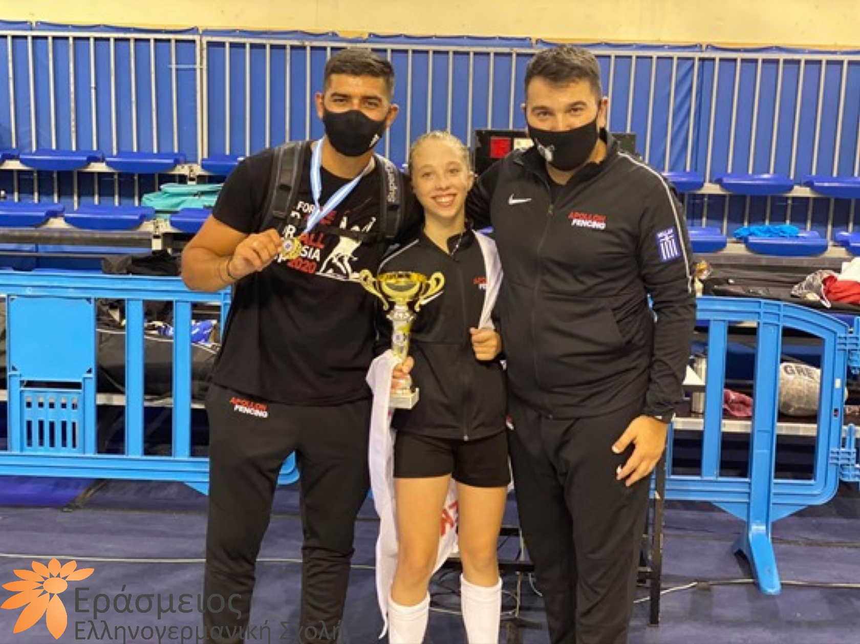 Πρωταθλήτρια Ελλάδος στη Ξιφασκία στο όπλο της Σπάθης αναδείχθηκε η αθλήτρια του Απόλλωνα Βριλησσίων Κουρούση Αλίνα, μαθήτρια της Α' Γυμνασίου της Σχολής μας, κατακτώντας την πρώτη θέση και το χρυσό μετάλλιο, στο Πανελλήνιο Πρωτάθλημα Παγκορασίδων Ξιφασκίας στο όπλο της Σπάθης, που πραγματοποιήθηκε στο Ολυμπιακό Στάδιο, στις 12 Σεπτεμβρίου 2020, υπό την αιγίδα της Ελληνικής Ομοσπονδίας Ξιφασκίας. Ήταν το καλύτερο ξεκίνημα για την μαθήτριά μας, αφού με τη νίκη της αυτή βρέθηκε στην πρώτη θέση της ελληνικής βαθμολογίας στην κατηγορία της. Επίσης, η Αλίνα με τις συμπαίκτριες της κατέκτησαν την επόμενη μέρα, 13 Σεπτεμβρίου 2020, το ασημένιο μετάλλιο στο ομαδικό της Σπάθης του Πανελλήνιου Πρωταθλήματος, με την ομάδα του Απόλλωνα Βριλησσίων.